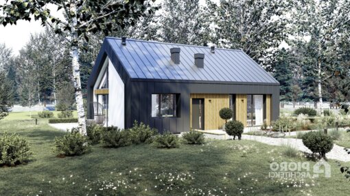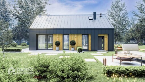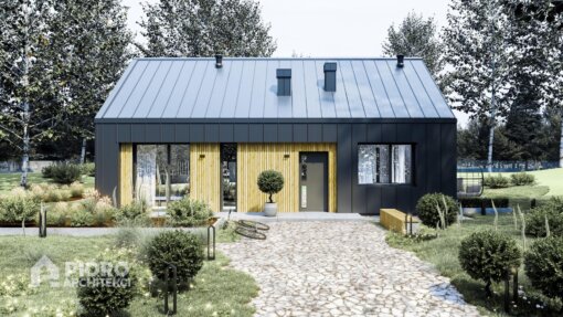 Nowoczesny projekt domu o powierzchni 86,4 m2 łączy elegancję z funkcjonalnością, kładąc nacisk na prostotę formy. Grafitowa elewacja współgra z jasnymi, drewnianymi panelami. Dach dwuspadowy z nietypowymi oknami doświetla wnętrze, a duże przeszklenia gwarantują jasność pomieszczeń. Projekt oferuje 4 pomieszczenia mieszkalne i zachowuje ciepłą atmosferę.