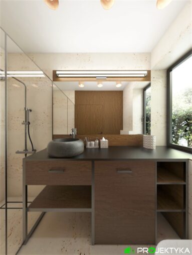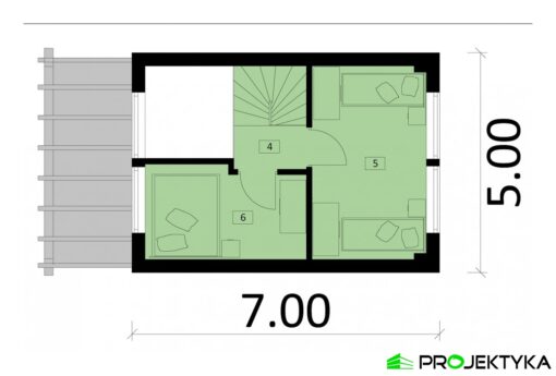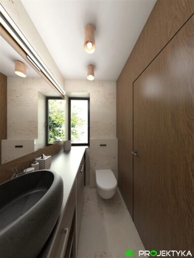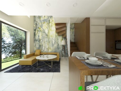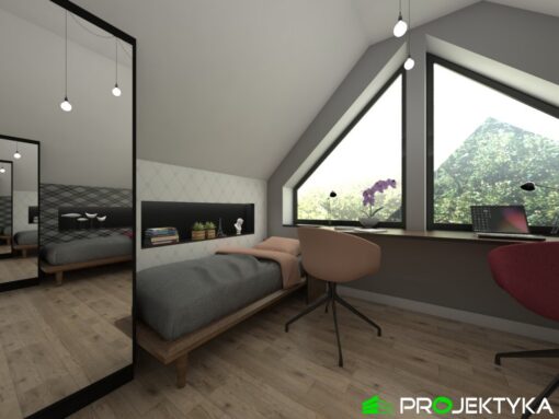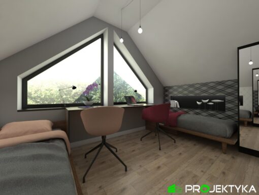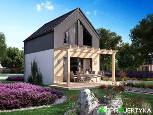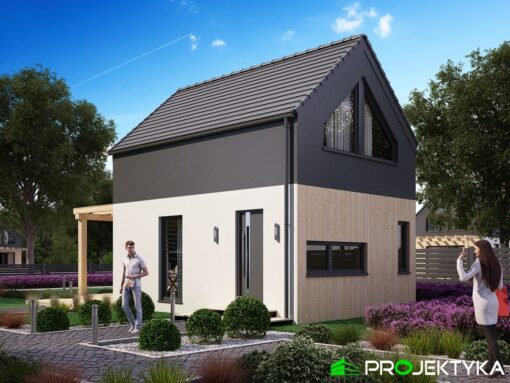 Ka151 Sz to elegancki dom piętrowy dla 2-4 osób, łączący w sobie nowoczesność i komfort. Na parterze znajduje się otwarta przestrzeń z salonem, aneksem kuchennym i łazienką. Poddasze oferuje dwie sypialnie, zapewniając spokój i prywatność. Oferując 42,45 m² powierzchni użytkowej, Ka151 Sz jest idealnym wyborem dla rodzin ceniących przemyślane rozwiązania i stylową architekturę.