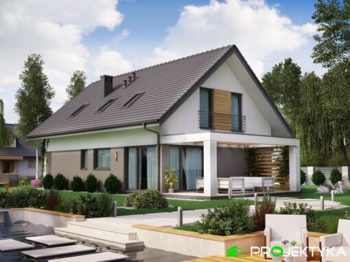 Dom drewniany z poddaszem w technologii szkieletowej dostępny w wersji mieszkalnej przeznaczony dla 2-4 osobowej rodziny.