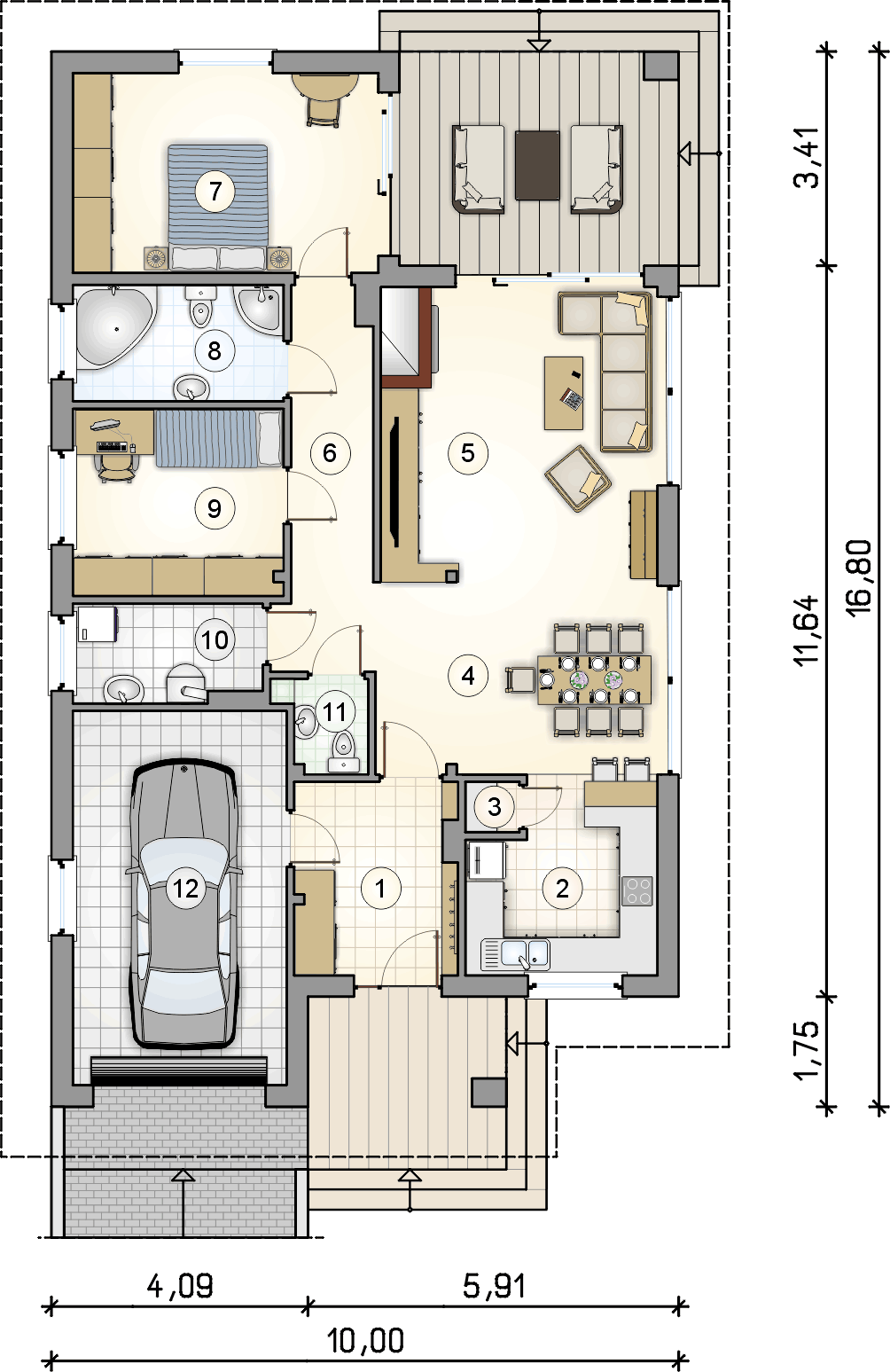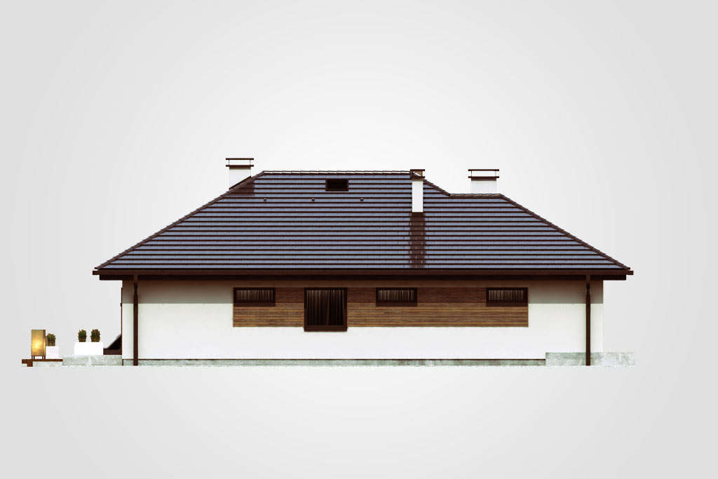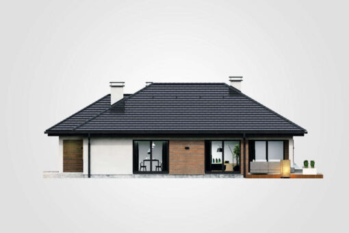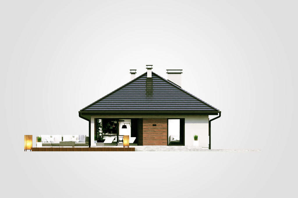 Dom drewniany parterowy w technologii szkieletowej dostępny w wersji mieszkalnej przeznaczony dla 2-4 osobowej rodziny.