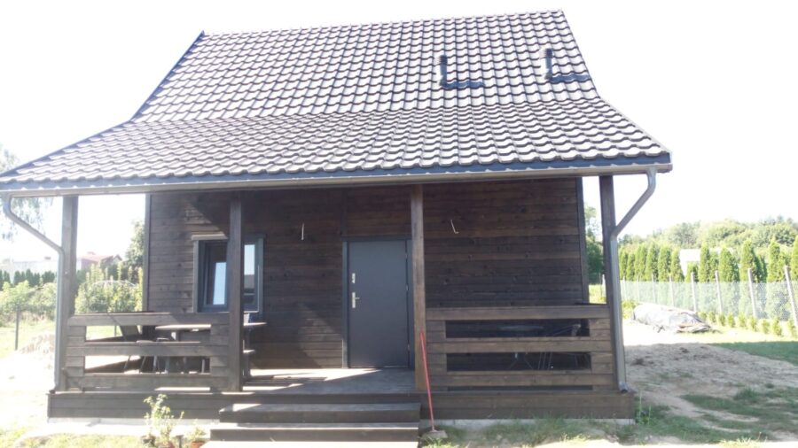 2. Wznoszenie konstrukcji – stan surowy otwarty: Konstrukcja domu szkieletowego o wymiarach 6,05 m na 7,21 m została wzniesiona z wykorzystaniem nowoczesnej technologii drewnianego szkieletu. Wysokość ściany kolankowej wynosi 1 metr, co pozwala na pełne wykorzystanie przestrzeni na piętrze, zwiększając funkcjonalność budynku. Elewacja została wykonana z płyt fermacell oraz poziomo ułożonej deski elewacyjnej o grubości 1,9 cm, co nadaje budynkowi nowoczesny wygląd.