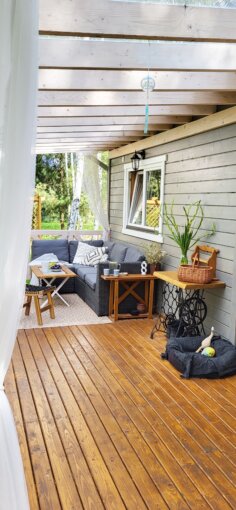 Dom o wymiarach 6 m na 8,5 m zyskał unikalny charakter dzięki elewacji wykonanej z minilogów oraz pergoli o wymiarach 2,5 m na 8,5 m, nadając przestrzeni elegancki i przytulny wygląd. Dodatkowo, niezabudowany ganek o wymiarach 3 m na 1 m sprawia, że budynek prezentuje się jeszcze bardziej uroczo.