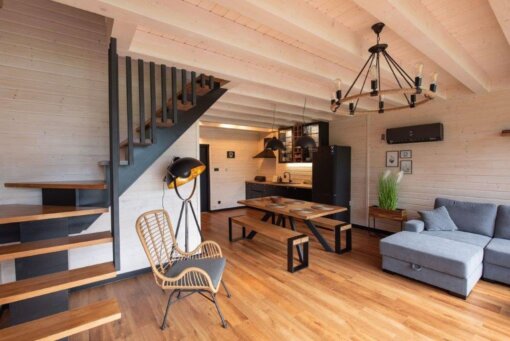 Elewacja zewnętrzna wykonana została z impregnowanych ciśnieniowo łat, co gwarantuje trwałość i odporność na warunki atmosferyczne. Nowoczesne schody zabiegowe z barierką zapewniają łatwy i bezpieczny dostęp do piętra, jednocześnie dodając charakteru całej konstrukcji.